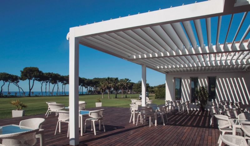 Las pérgolas bioclimáticas son un sistema domótico para tu terraza que funciona mediante unas lamas motorizadas que se pueden abrir y cerrar para regular la cantidad de luz, temperatura, humedad y aire de su espacio interior. Protegen del sol y refrescan el ambiente al dejar pasar el aire a la vez que ofrecen sombra.